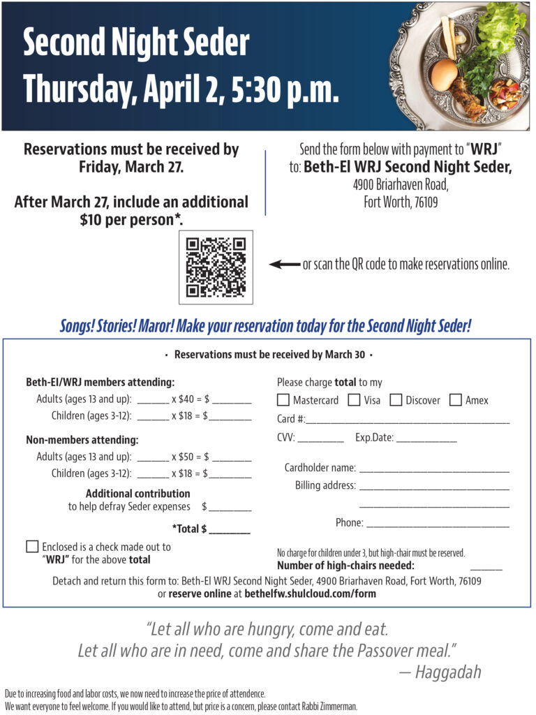 Participate in a second night seder with your fellow congregants at Beth-El Congregation. The seder will be led by Rabbi Zimmerman. Please click on the flyer for more details.